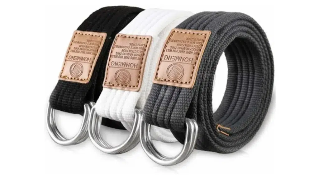 A belt with two metal D-shaped rings used to tighten instead of a traditional buckle. Often found on casual or utility outfits.